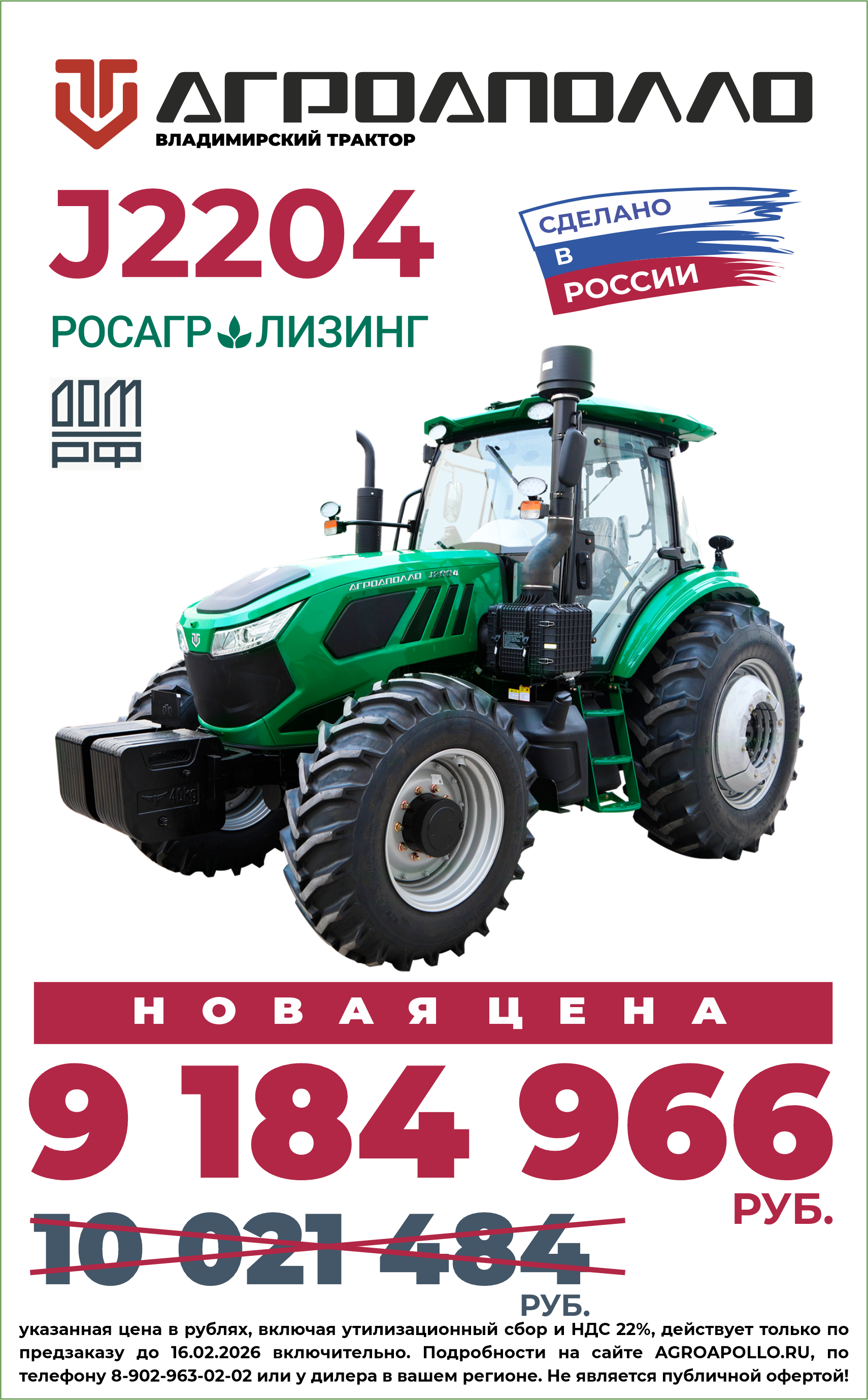 только до 16.02.2026 стоимость трактора АГРОАПОЛЛО J2204 по предзаказу